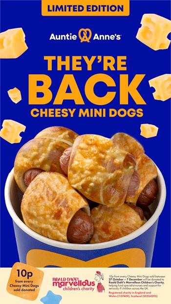 As part of Auntie Anne’s ongoing partnership with Roald Dahl’s Marvellous Children’s Charity, 10p from every Cheesy Mini Dog sold will be donated to support specialist nurses who care for seriously ill children across the UK.
